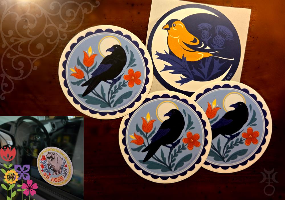 I've always had a "thing" for the Pennsylvania Dutch Hex signs. Was just always drawn to them. Now, I LOVE these interpretations! The crow "distlefink" is my favorite. Bought some previously for myself and my kids, and had to come back for more, AND the "Go Away" raccoon. Which I already put on my truck. And thanks for the goldfinch (thistlefinch) sticker! I like how you incorporated a crescent moon and subtly added thistles. Great design! Thank you so much!