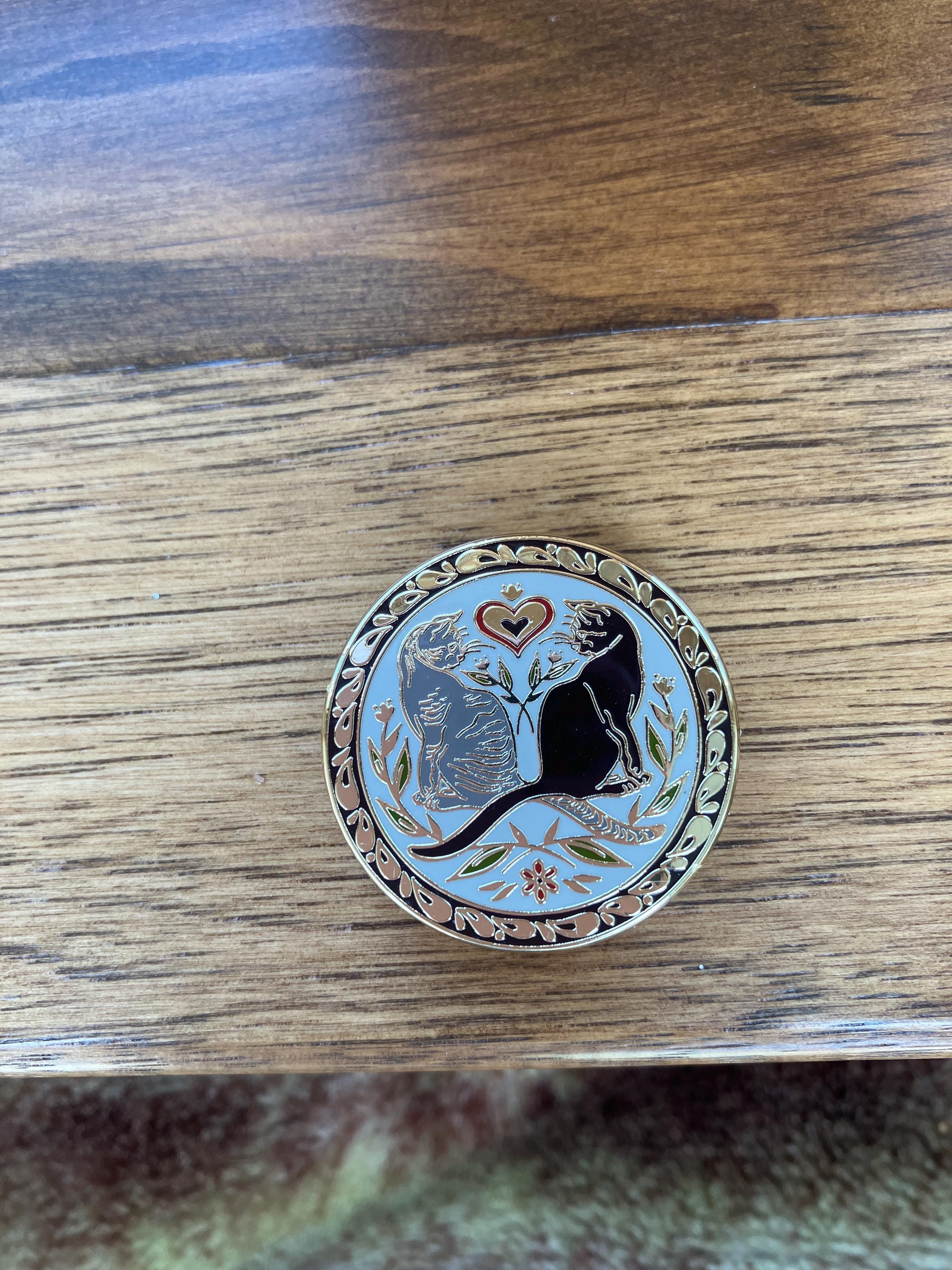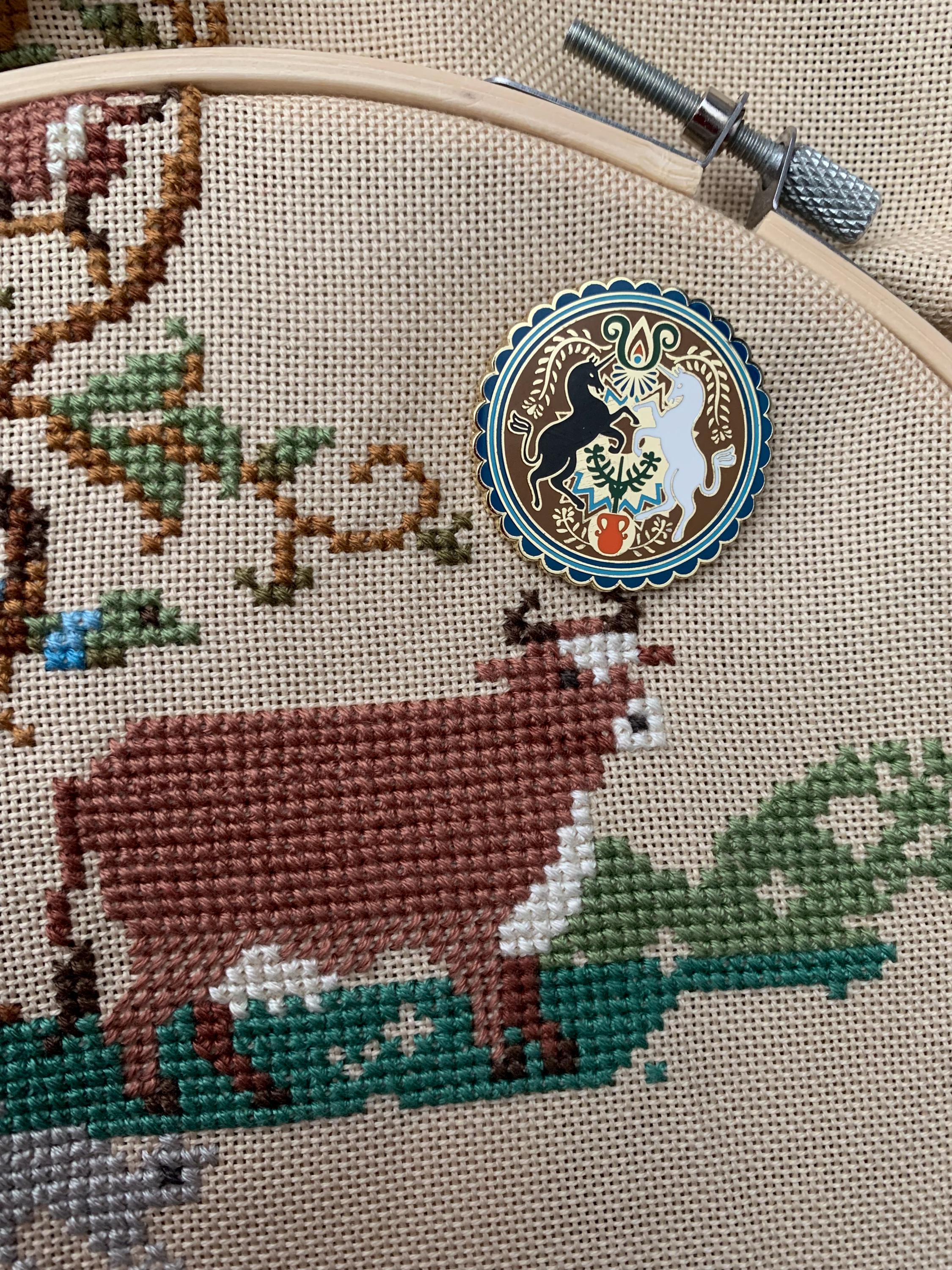 This enamel needle minder features a modern take on a traditional PA Dutch design of dueling unicorns, a symbol of harmony in nature in PA Dutch hex signs and fraktur art.
