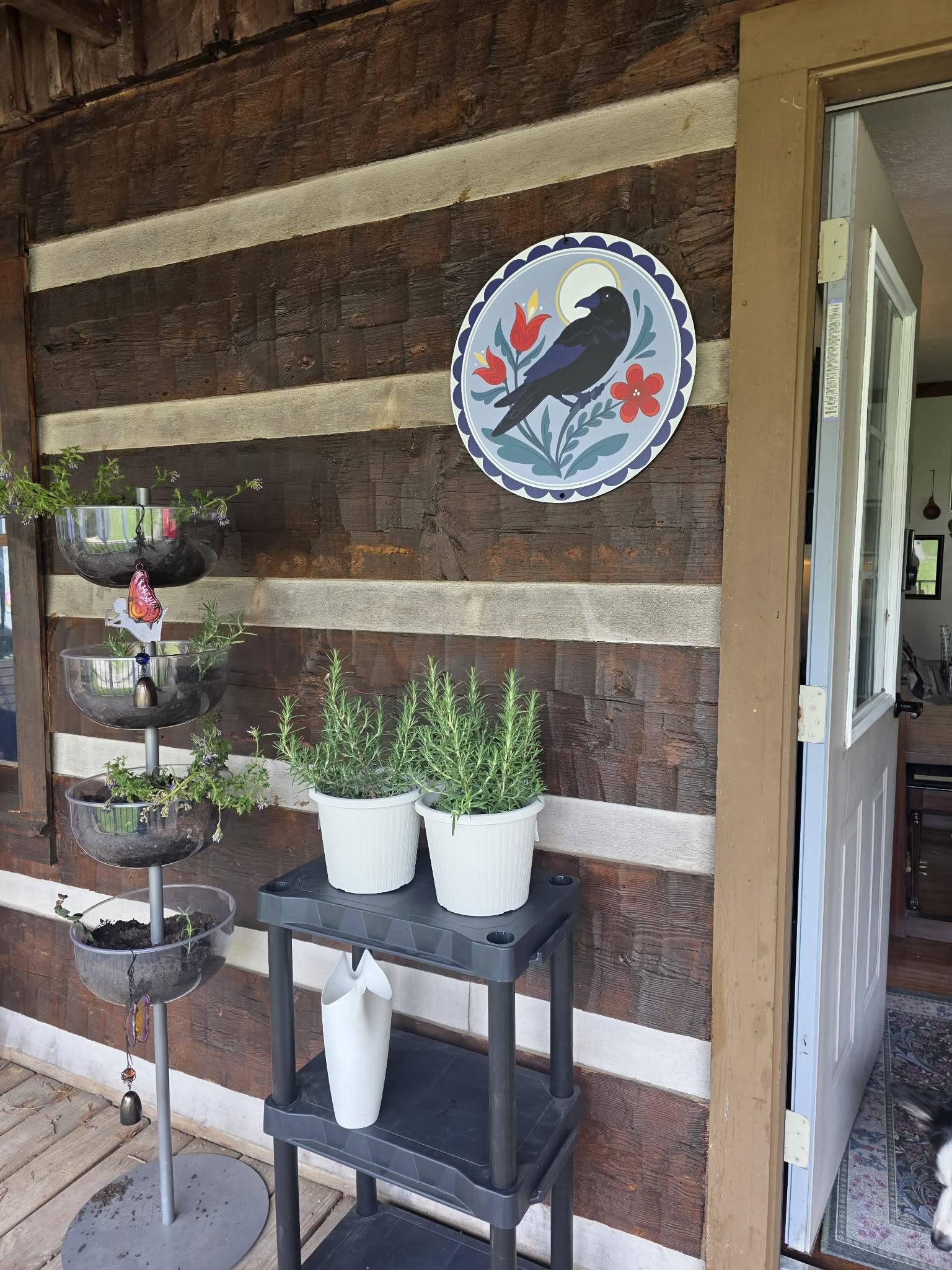 This round metal wall hanging features a modern take on traditional PA Dutch hex sign elements.