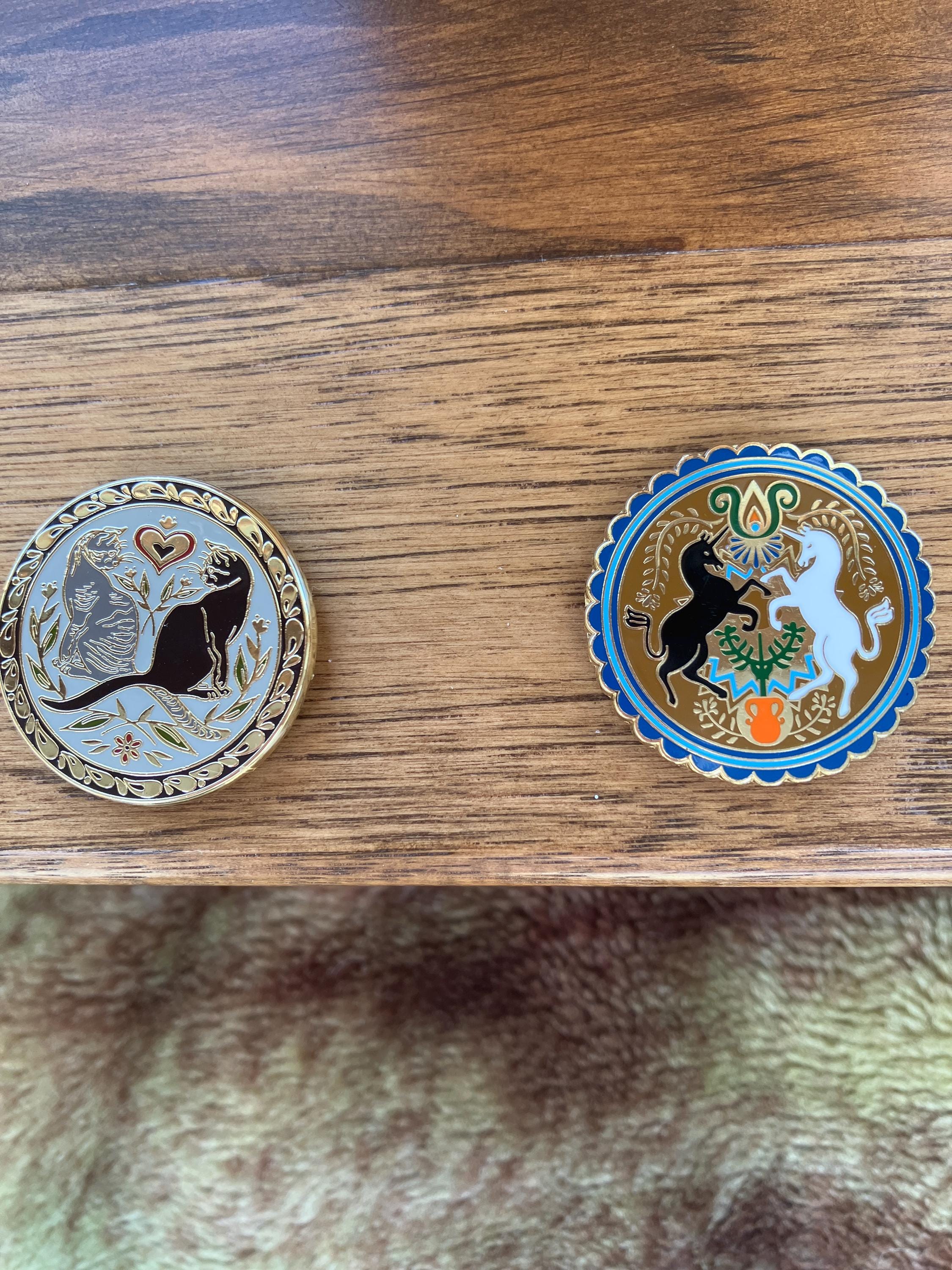 This enamel needle minder features a modern take on a traditional PA Dutch hex sign design.